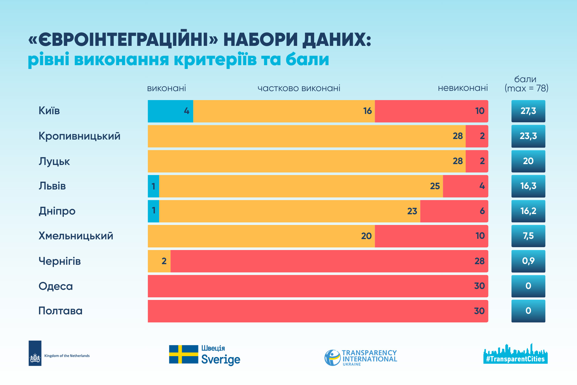 Середній рівень виконання 30 індикаторів, які стосуються публікації «євроінтеграційних» наборів, у 9 містах (без Запоріжжя і Харкова) становить 15,9%. Найвищий результат у Києва – 27,3 із 78 балів.