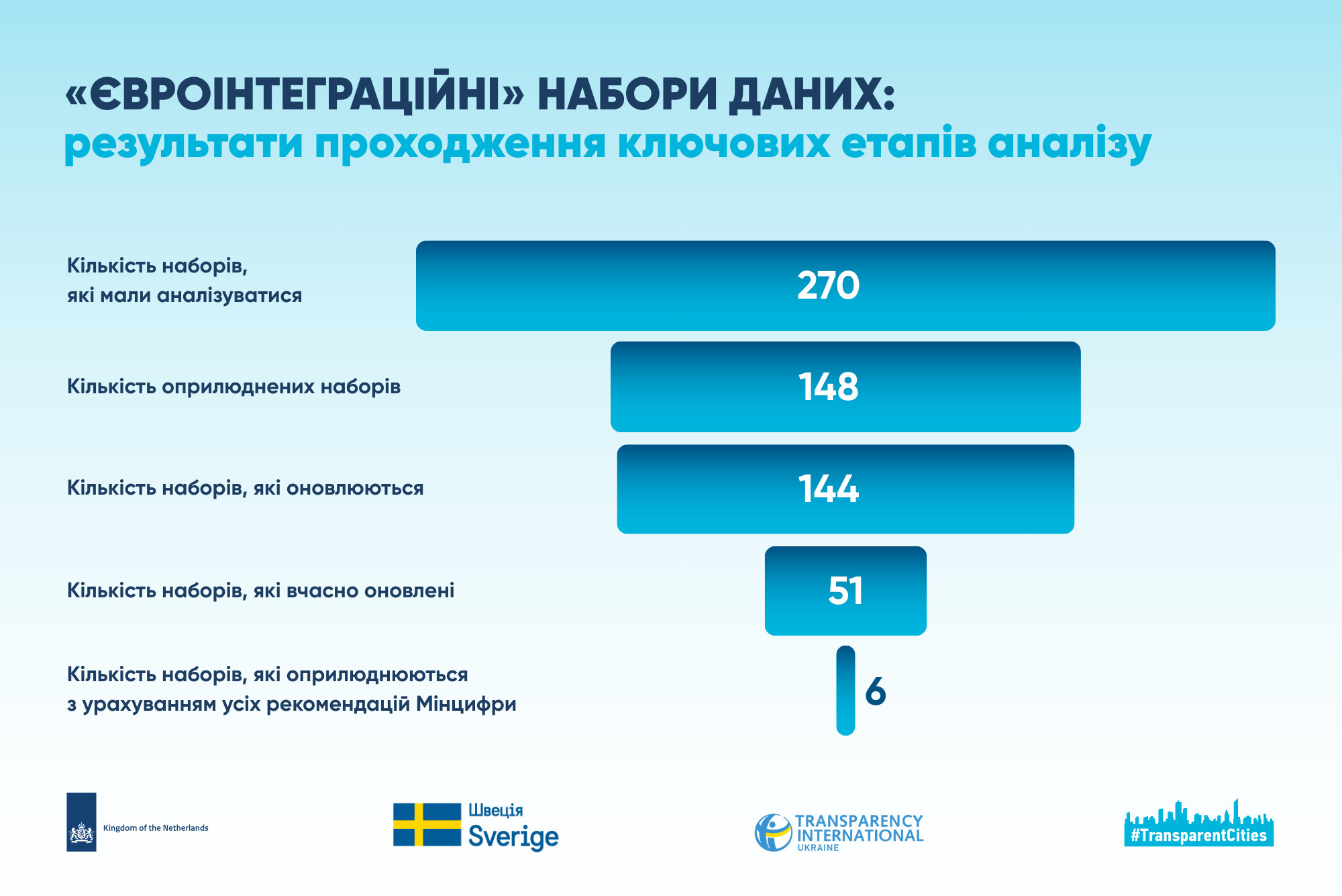 Із 270 «євроінтеграційних» наборів, які аналітики шукали в 9 електронних кабінетах, станом на 5 грудня 2025 року були оприлюднені 148 (55%). Із них лише 51 набір мав вчасно оновлені ресурси. Цей результат значною мірою зумовлений тим, що Дніпровська, Кропивницька, Луцька, Львівська міські ради – лідери за кількістю оприлюднених наборів – користуються власними порталами відкритих даних, а Мінцифри не може забезпечити регулярне щомісячне перенесення даних з цих порталів на data.gov.ua.