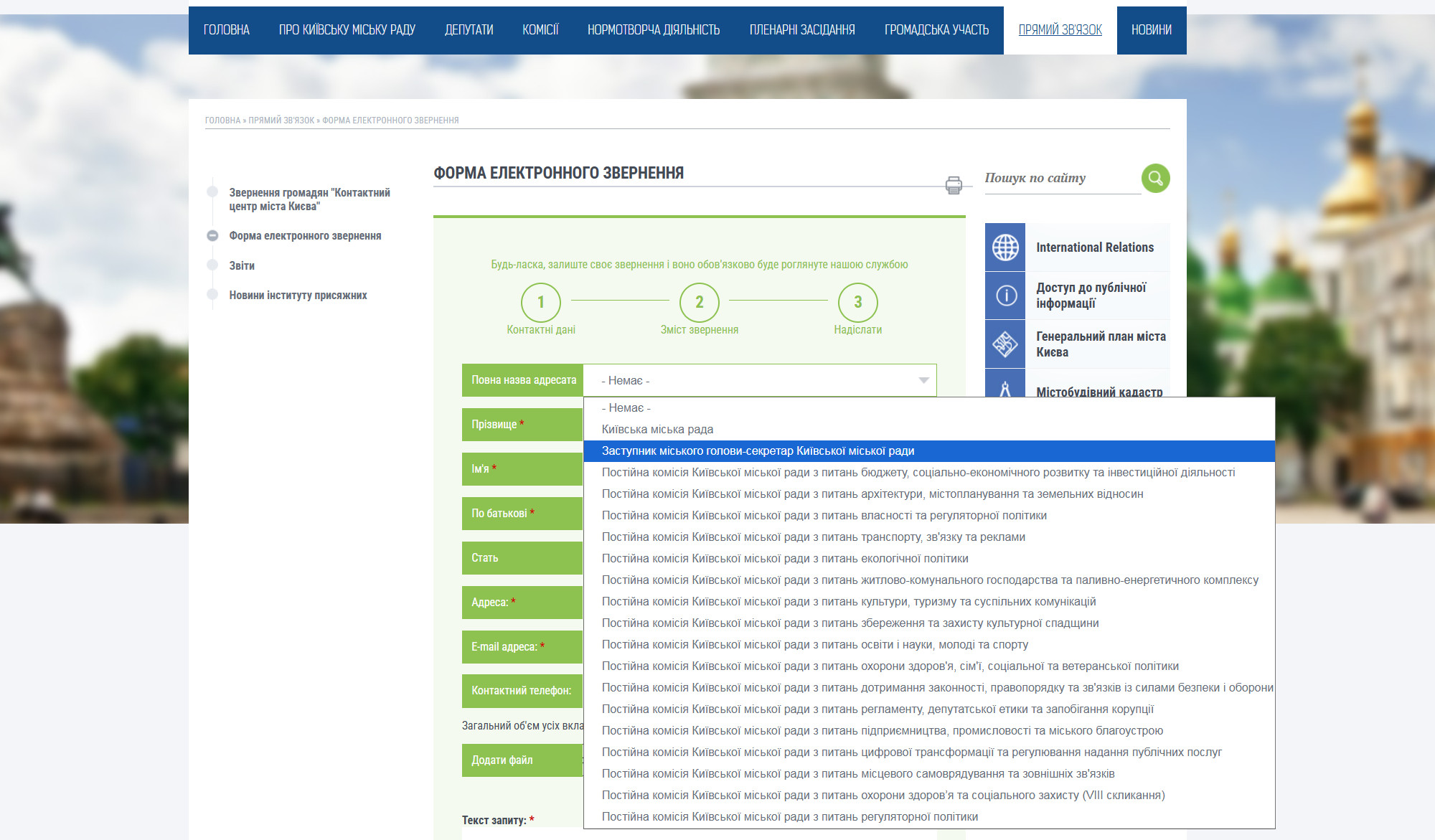 Зрештою вдалося знайти спосіб подати заяву онлайн. Її надіслали через форму електронного звернення. Адресатом було обрано опцію «Заступник міського голови-секретар Київської міської ради», згідно з бланком заяви.