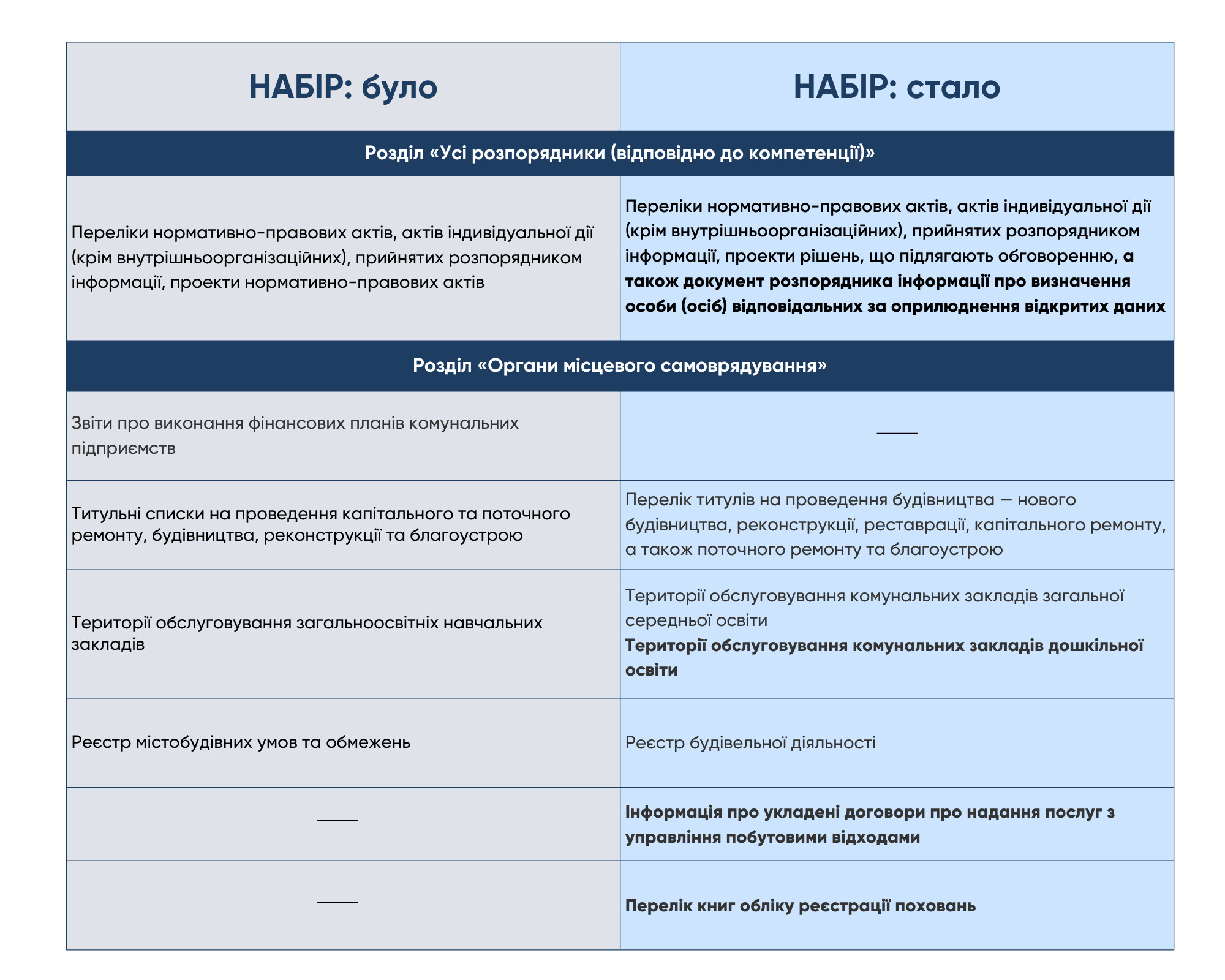 Як бачимо, з розділу «Органи місцевого самоврядування» зник один набір, натомість з’явились три нові (їх назви виділені напівжирним). Три інші набори були перейменовані.