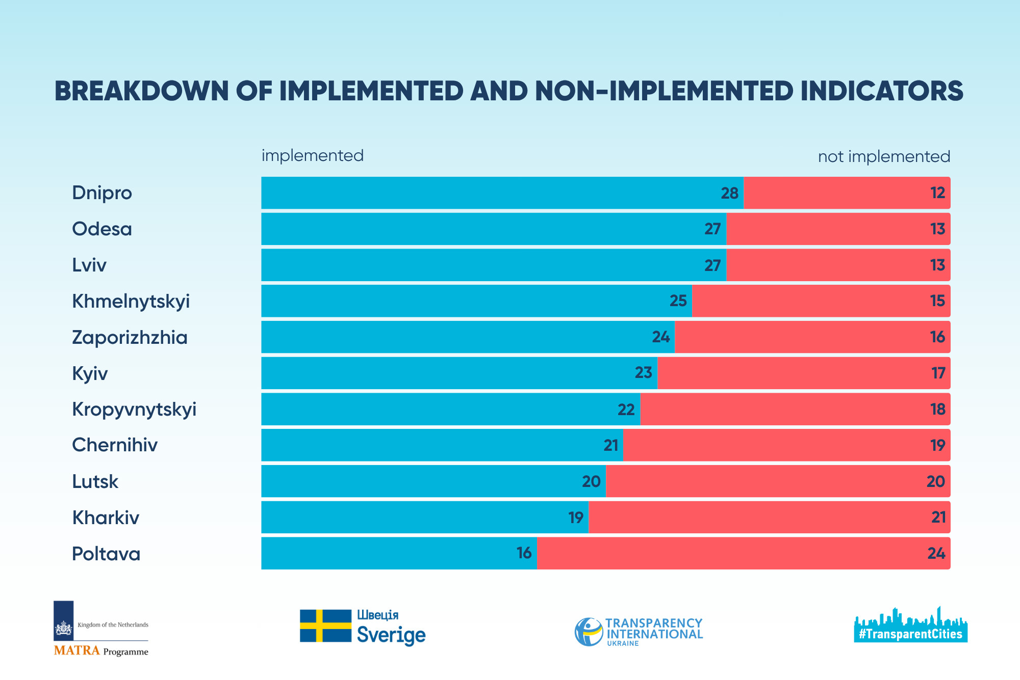Two cities with the status of territories of potential hostilities — Kharkiv and Zaporizhzhia — took part in the study. Despite facing similar challenges, these regional centers performed differently in meeting openness requirements. Zaporizhzhia implemented 24 indicators, while Kharkiv met 19. These results are consistent with the performance of frontline cities in the 2024 assessment.