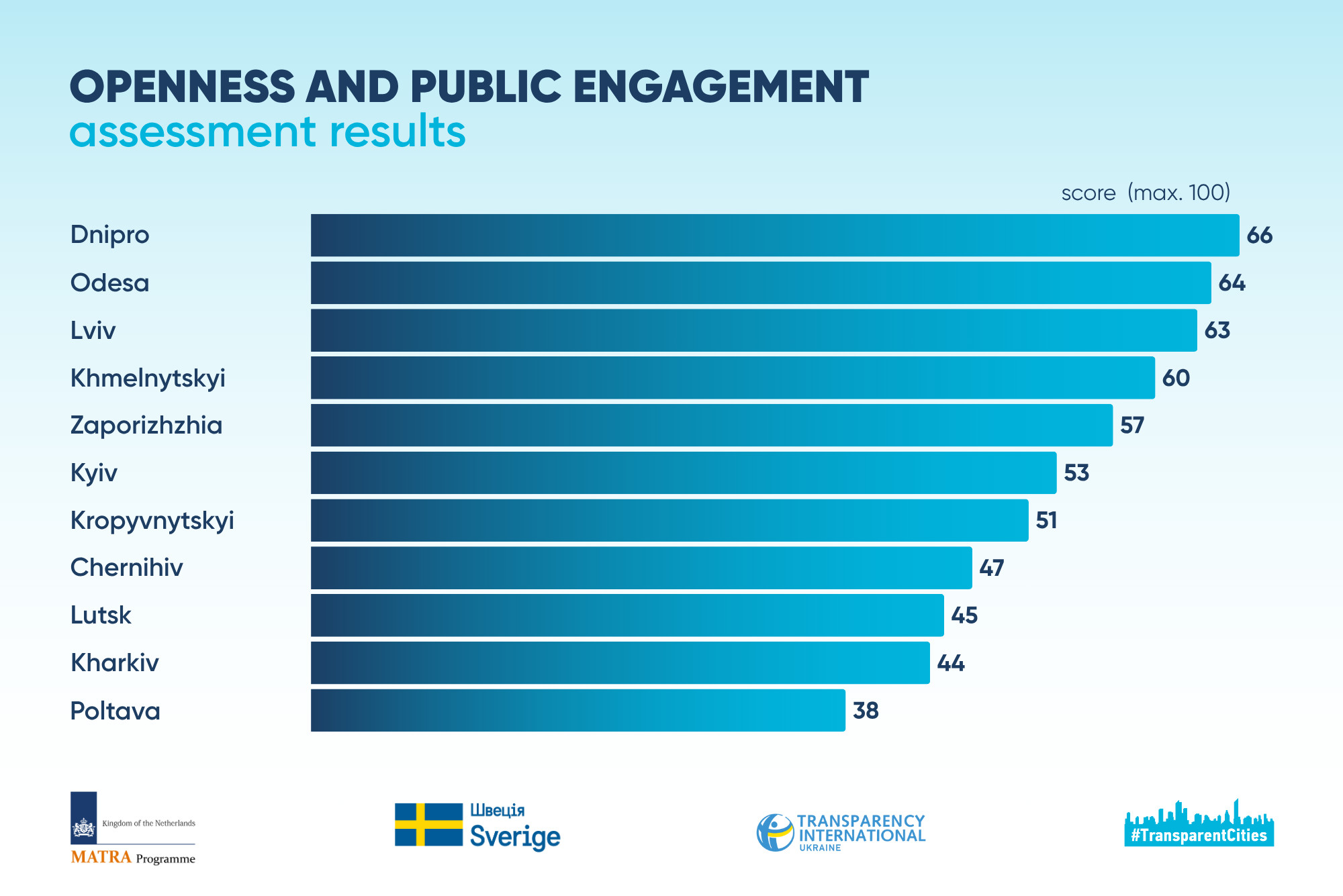 For that reason, the Transparent Cities program studies to what extent Ukrainian cities are prepared for the EU integration in those matters. As part of the pilot format of our research, analysts evaluated the openness of municipalities based on European approaches.