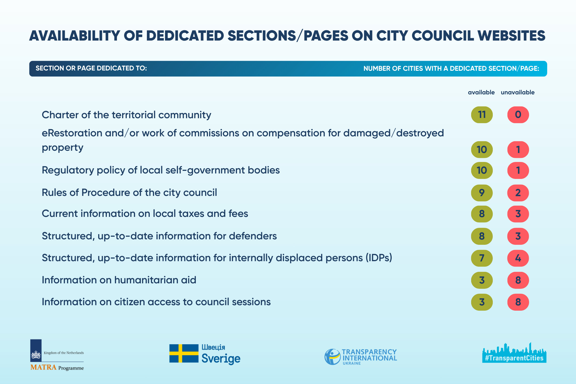 The most problematic topics — absent as unified sections in eight cities — were humanitarian aid and citizen access to council sessions. A dedicated page outlining the algorithm for accessing council sessions is a prerequisite for a straightforward path from a citizen’s intention to attend a meeting to the practical ability to do so. Program analysts have detailed what proper disclosure of this information should entail.