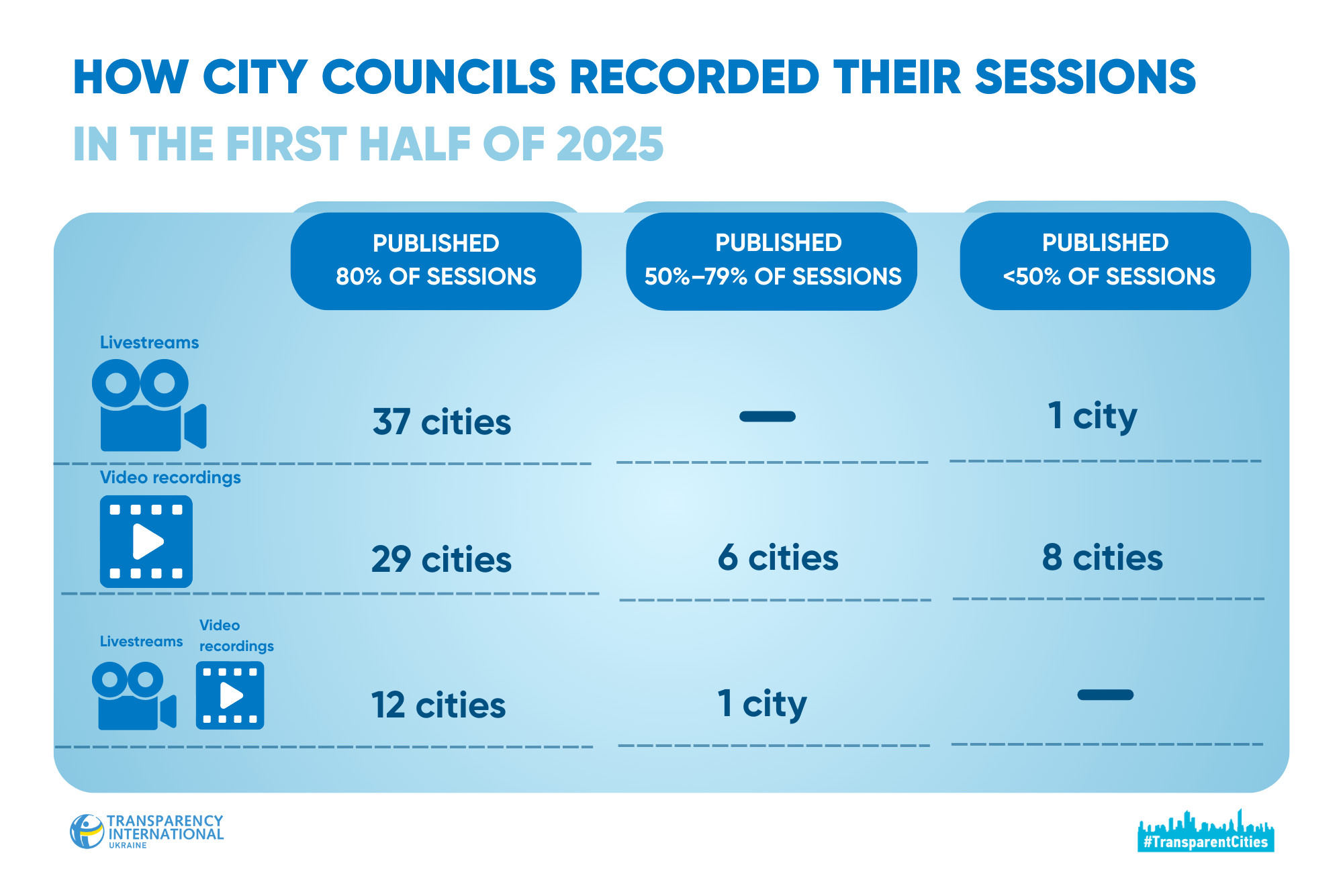 The first half of 2025 shows noticeable progress in video recording and broadcasting of city council sessions. Transparent Cities calls on municipalities to continue improving their practices — refining formats, making access more convenient, and thereby giving residents a genuine opportunity to influence the governance of their city.