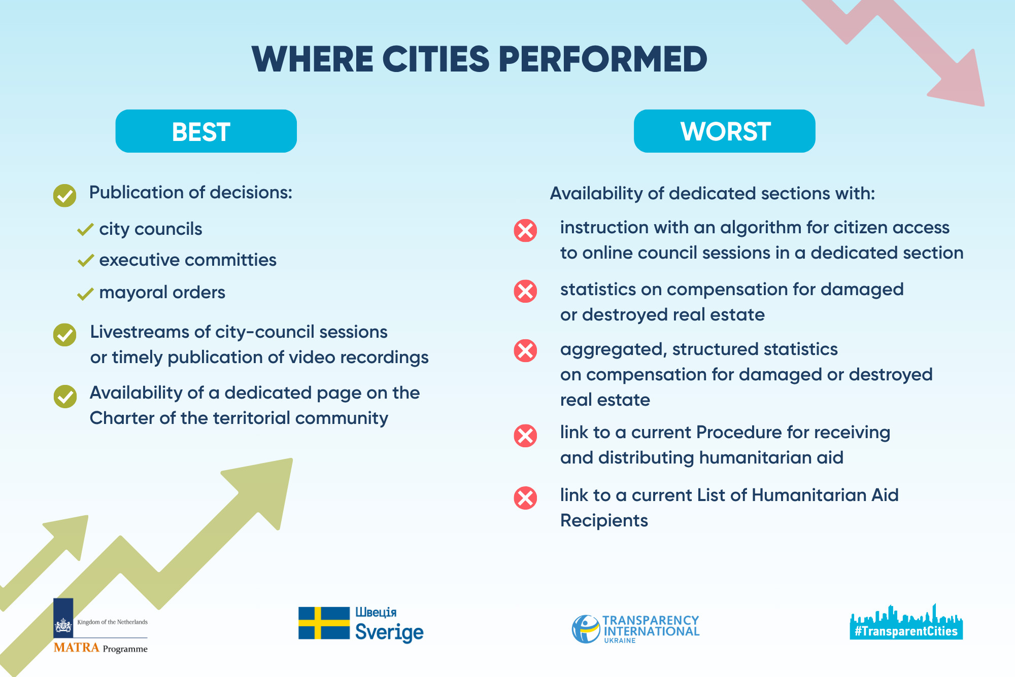The study also included two cities officially designated as territories of potential hostilities — Zaporizhzhia and Kharkiv. Despite similar challenges, their performance on openness varied. Zaporizhzhia implemented 24 indicators, while Kharkiv met 19.