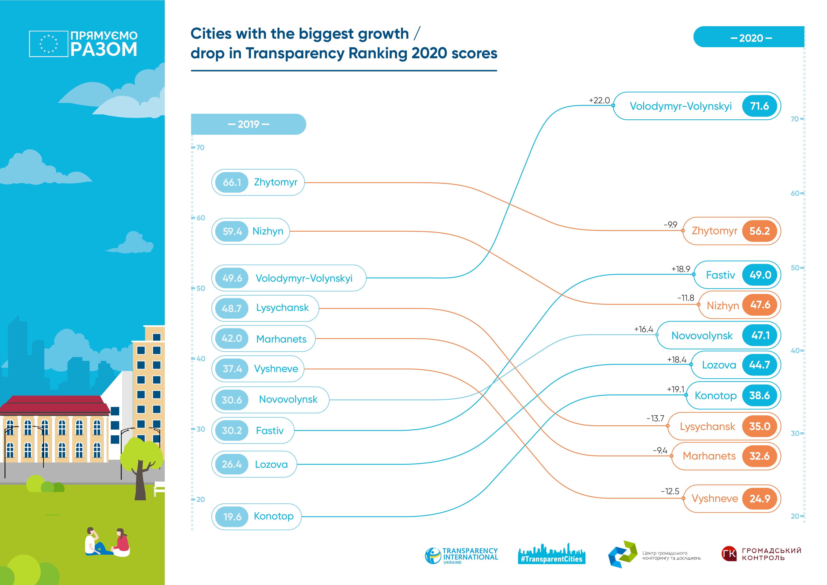 Volodymyr-Volynskyi added 22 points to its 2019 score. The city rose by 27 positions and, for the first time, reached the top ten in transparency. During the year, the city council improved the results in most spheres, gained 8 points in “Municipal enterprises” and 6 points in “Housing Policy.” Simultaneously, the indicators in “Municipal property” and “Access and participation” dropped by a few tenths.